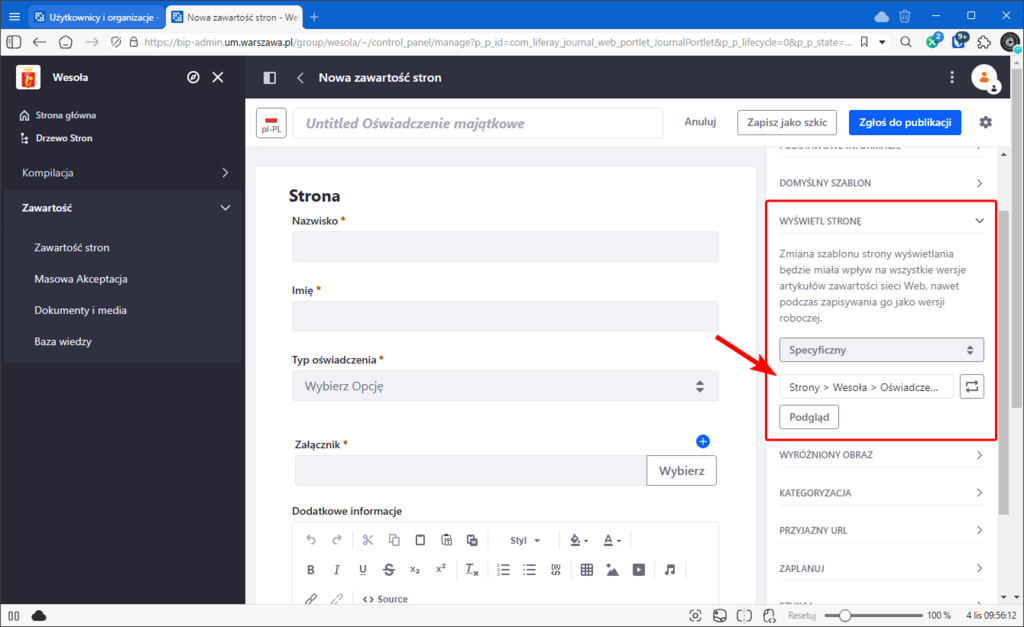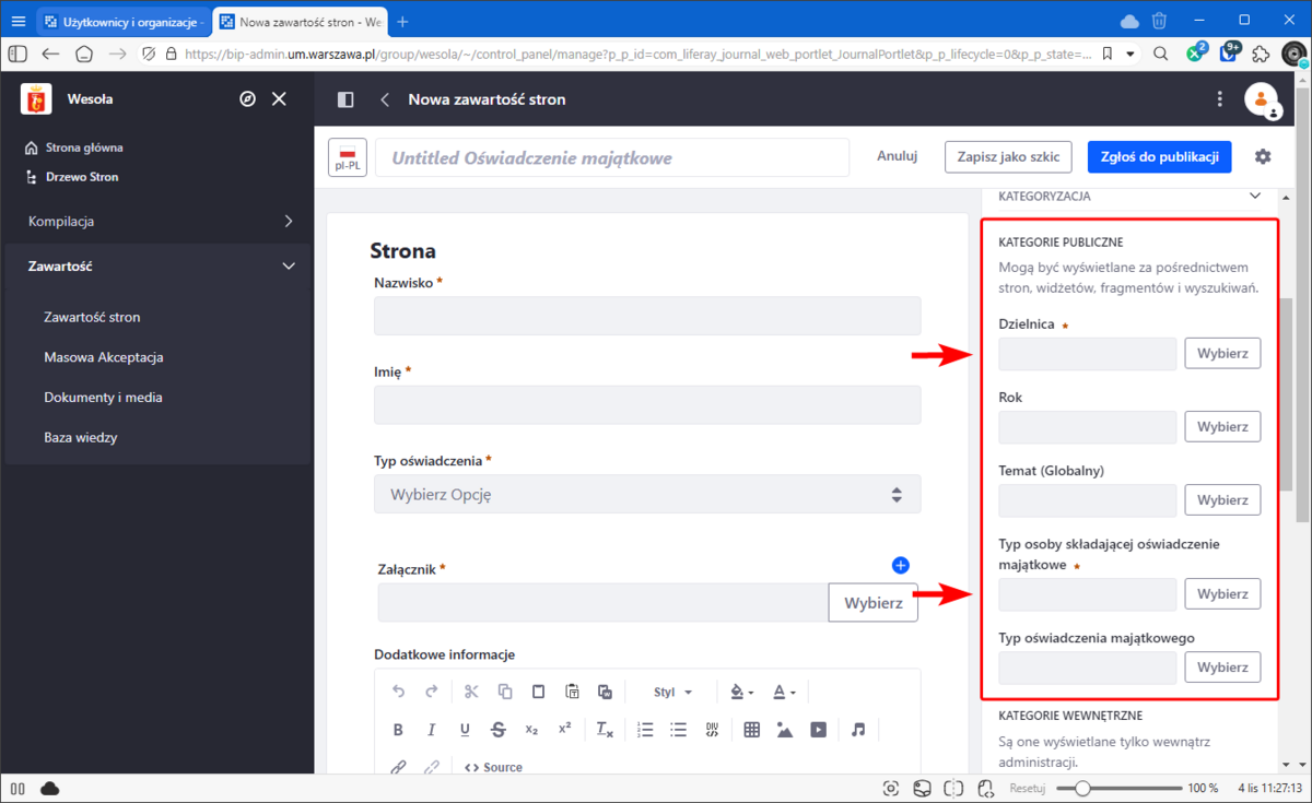 W panelu po prawej stronie należy odnaleźć i rozwinąć sekcję "Kategoryzacja" i w "Kategorie publiczne" wskazać: