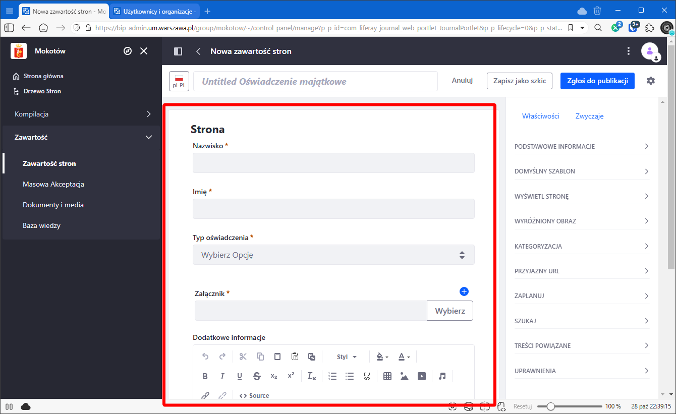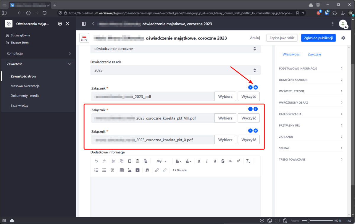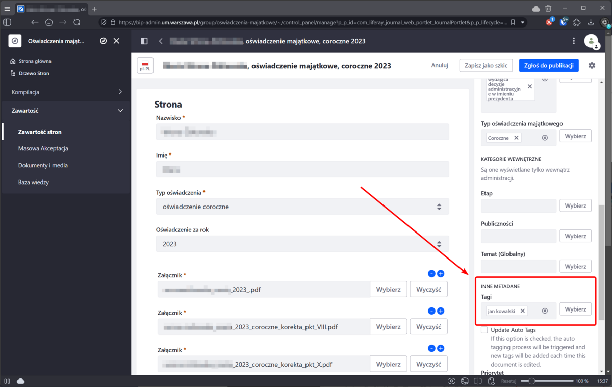 Pozostałe kategorię uzupełnią się automatycznie na podstawie danych wprowadzonych do pól formularza w momencie zapisania szkicu artykułu, czyli naciśnięcia "Zapisz jako szkic" lub zgłoszenia artykułu do publikacji (przycisk "Zgłoś do publikacji")
