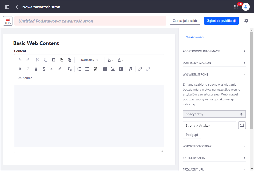 - Podstawowa zawartość stron to najprostszy szablon do wprowadzania treści.