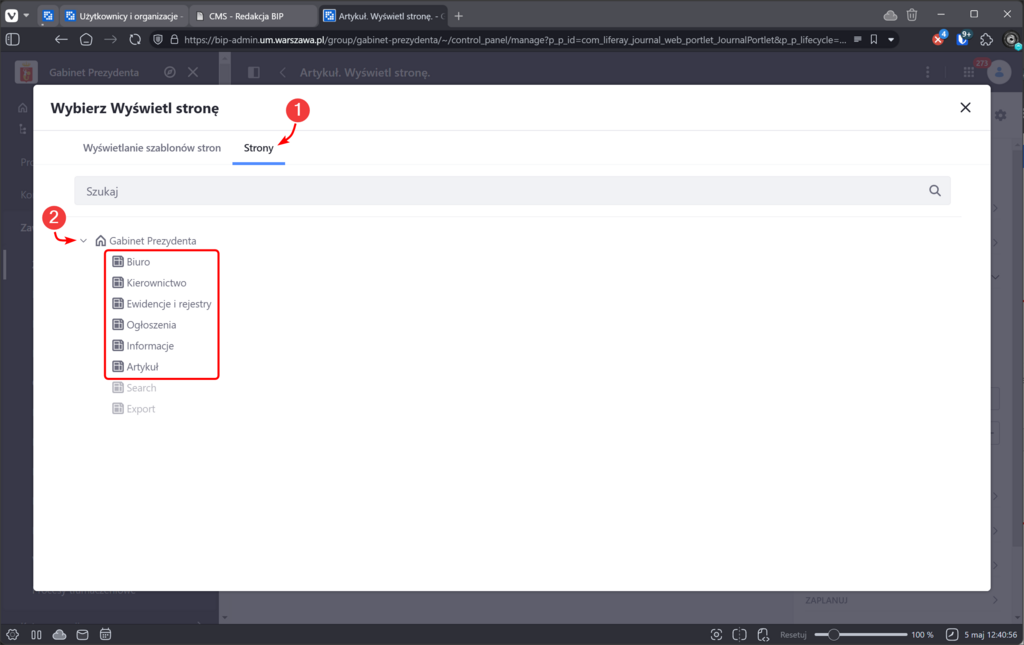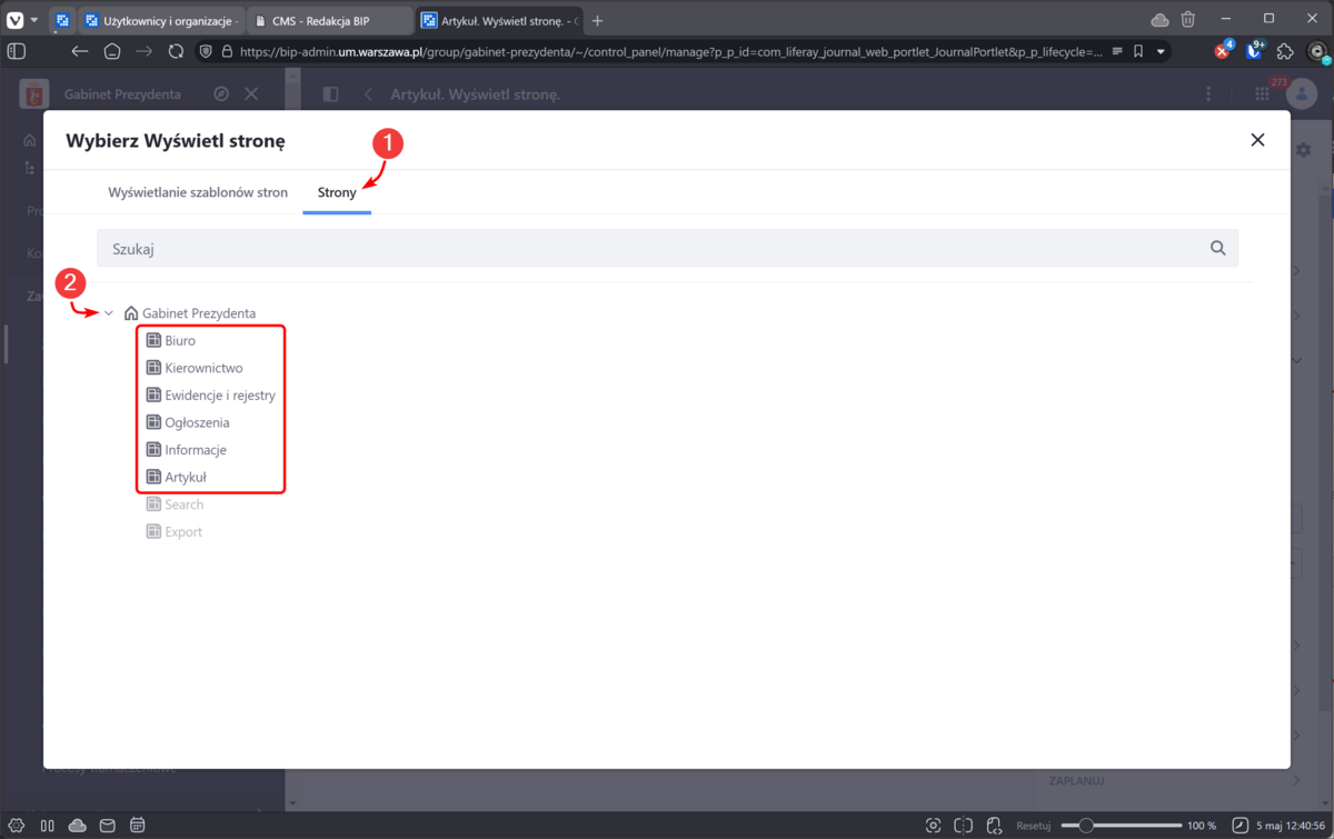 - wskaż jedną stronę (nie możesz wskazać stron "wyszarzonych"); wybieraj strony, których nazwa odpowiada treści artykułu, np. w artykułach z ogólnymi informacjami wskaż stronę "Artykuł" lub "Informacje", artykuł z ogłoszeniem stronę "Ogłoszenia" itd.