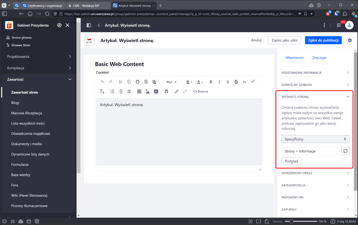- Specyficzną stronę wyświetlania wskazujesz w trybie edycji artykuły w panelu po prawej stronie, w sekcji "Wyświetl stronę"